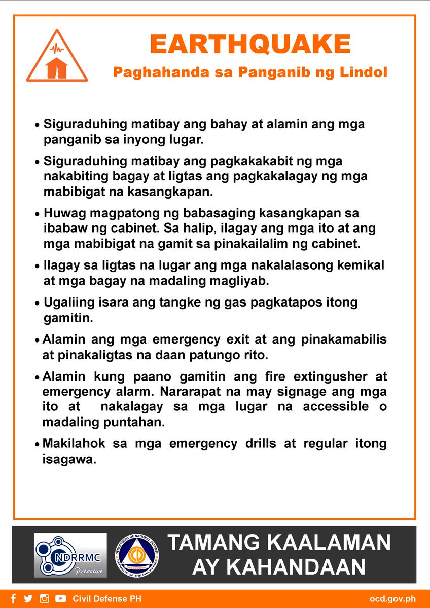 Tukuyin ang lugar kung saan dapat magkita-kita ang mag-anak pagkatapos ng lindol dahil maaaring mawalan ng komunikasyon. Narito pa ang ilang mga tips na dapat gawin pagkatapos ng lindol Huwag. Bahagyang malakas na lindol.