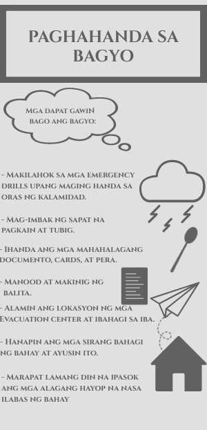 Paghahanda para sa bagyo text design. Magtabi o maghanda ng mga pagkain. SA nakaraang kolum tinalakay ko ang paghahanda sa grab bag. Ang Paghahanda sa Baha ay Responsibilidad ng Lahat Pagkaraan ng Baha Gumamit lamang ng de-bateryang lente kung muling papasukin ang binahang tahanan o gusali.